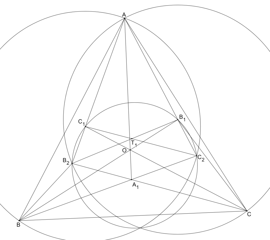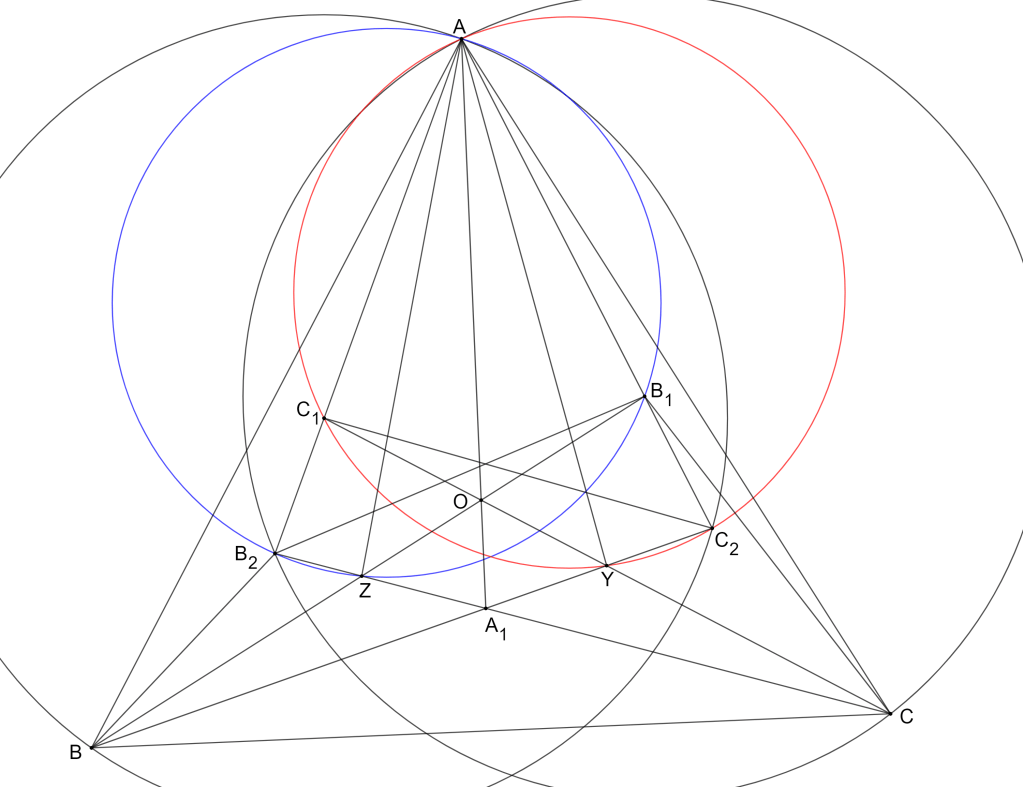 , tương ứng. Chứng minh rằng đường tròn ngoại tiếp của tam giác tạo bởi ba đường thẳng